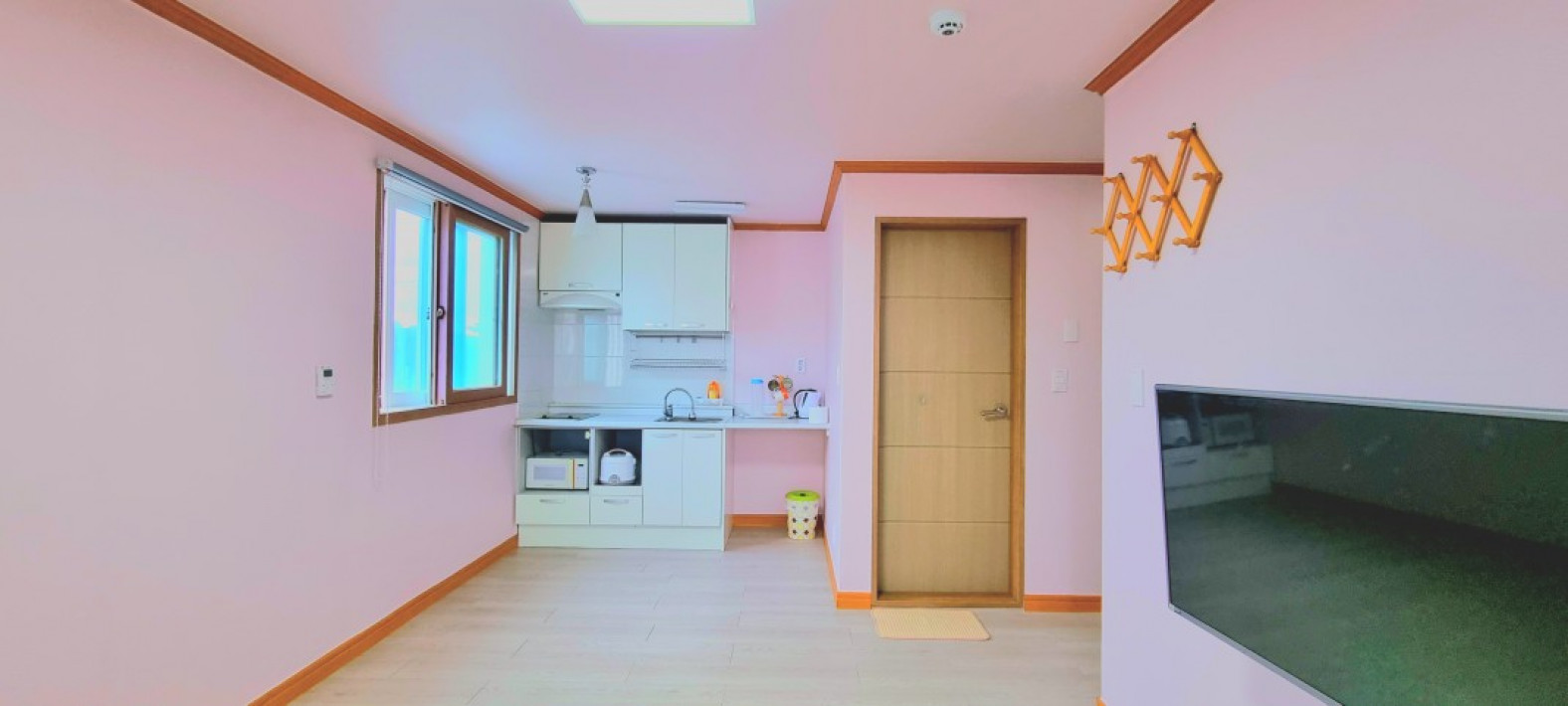 방 정보 객실명 형태(스타일) 크기 인원(기준/최대) 201호(가족) 온돌 8평 2/3 가격 정보 비수기 준성수기 성수기 추가요금 주중 주말 주중 주말 주중 주말 60,000원 100,000원 80,000원 130,000원 80,000원 130,000원 원 시설안내 구비용품: TV, 에어컨, 헤어드라이기,주방조리기구, 냉장고, 전기밥솥, 인덕션, 커피포트, 식기류, 침구류 샴푸, 린스,바디샴푸, 수건,칫솔 치약,티슈 부대시설: 바비큐장 서비스: 전기자전거대여, 각종 커피,차,1층정수기 목록